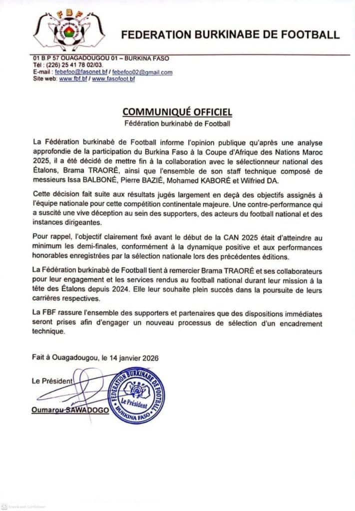 La Fédération burkinabè de Football (FBF) a annoncé, ce 14 janvier 2026, la fin de sa collaboration avec le sélectionneur national des Étalons, Brama Traoré, ainsi qu’avec l’ensemble de son staff technique. Cette décision intervient à l’issue d’une analyse approfondie de la participation du Burkina Faso à la Coupe d’Afrique des Nations Maroc 2025.